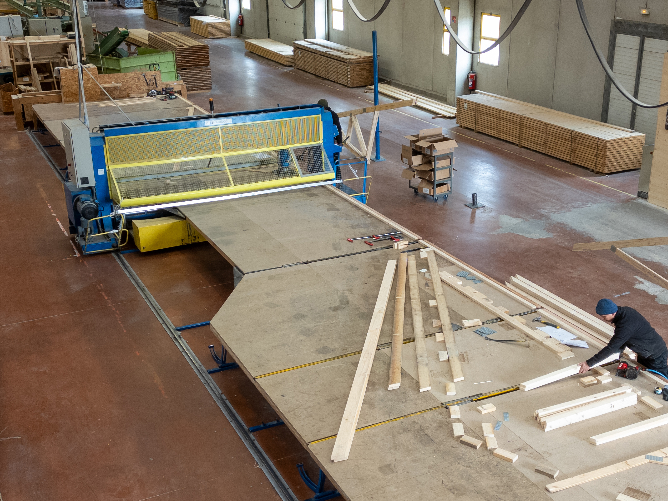 La presse à connecteur permet de placer les différents éléments en bois (entraits, arbalétriers, etc.) selon le plan défini, avec des cales de positionnement clouées à la main sur la table. C’est un gain de précision et de temps.