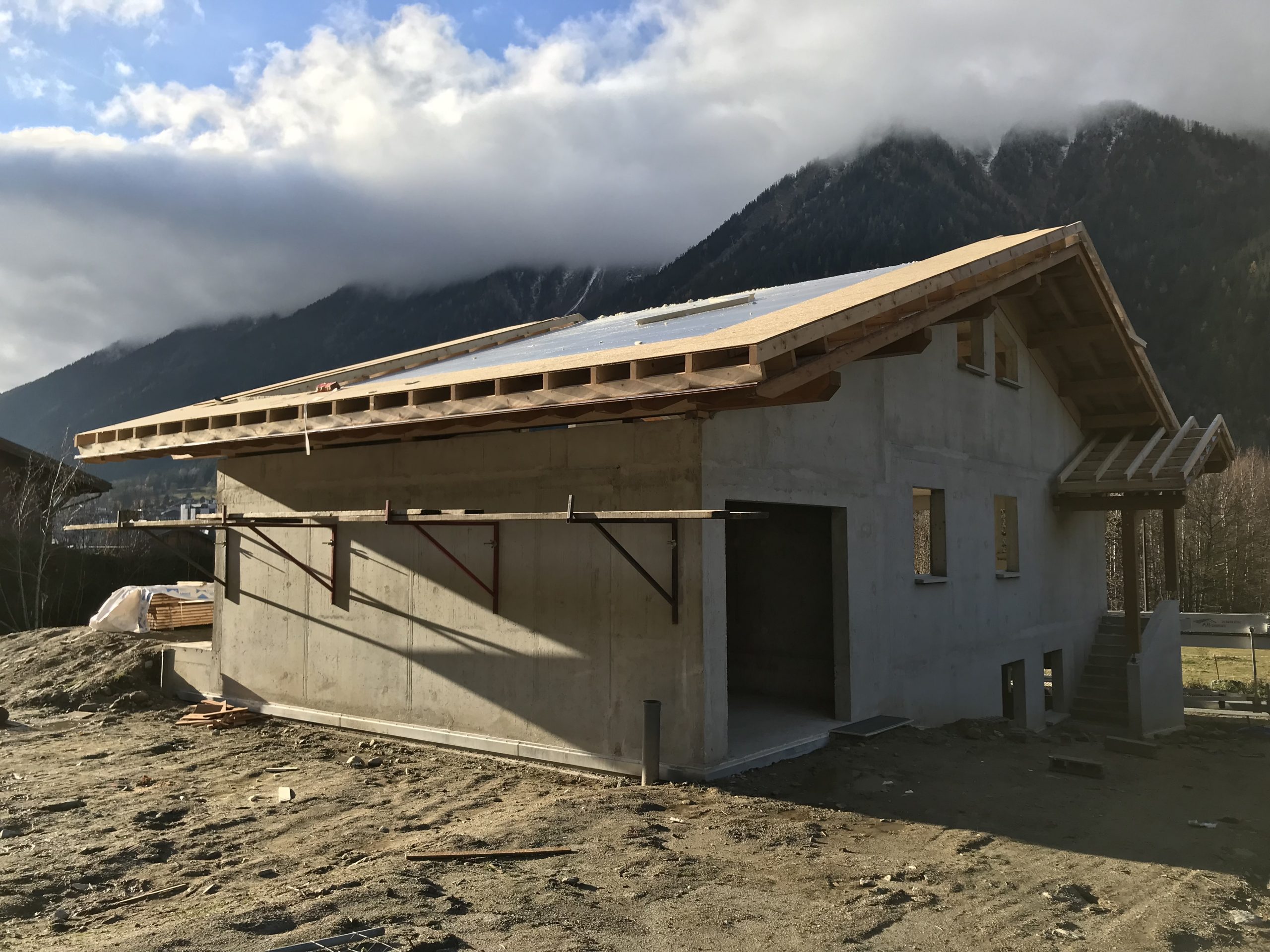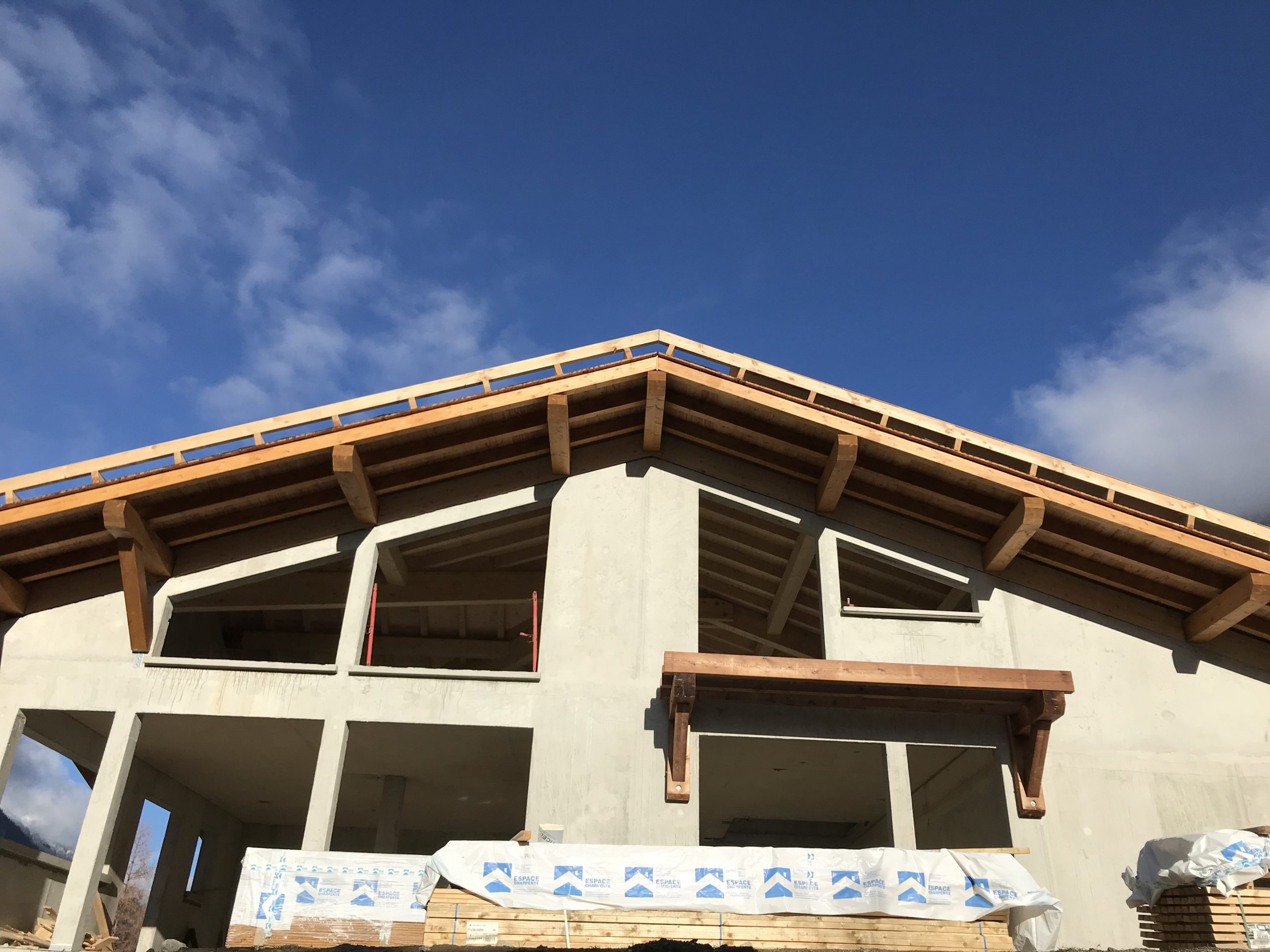 C’est toujours un plaisir de voir sortir de notre atelier une œuvre comme celle-ci : une charpente traditionnelle massive, entièrement taillée dans nos locaux à Scientrier, puis assemblée dans ce cadre unique de Chamonix.