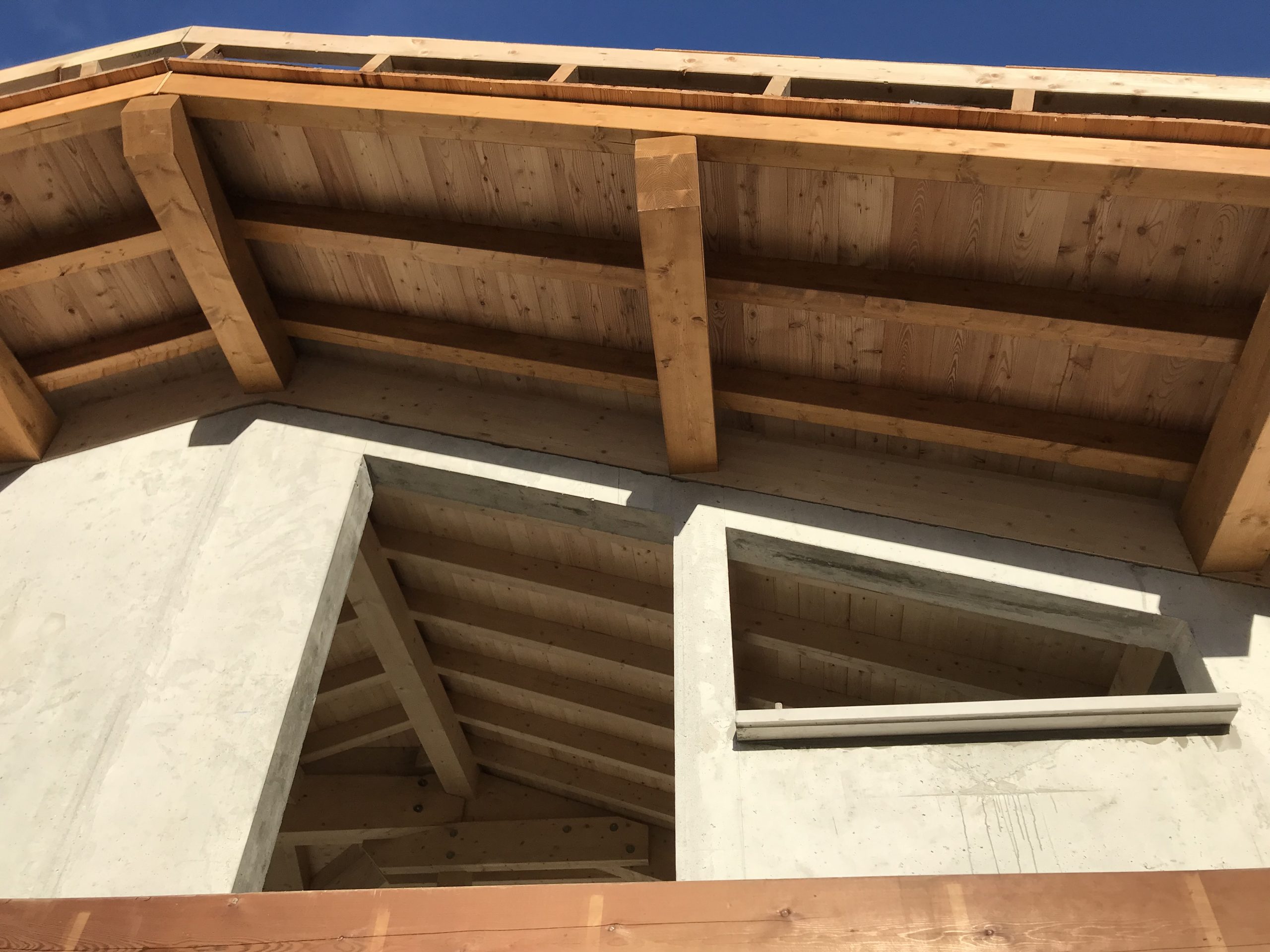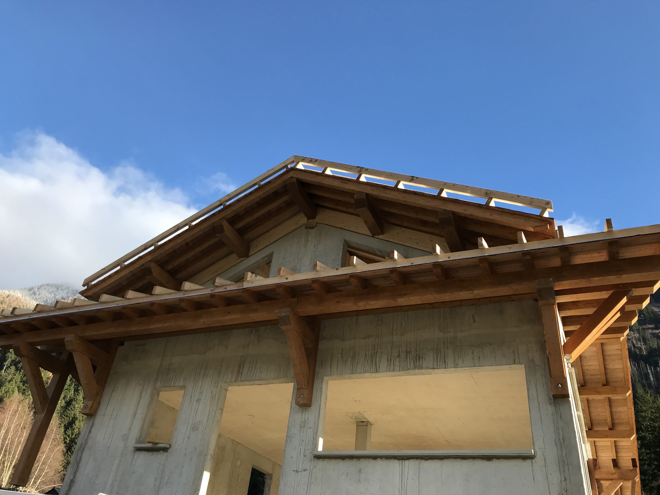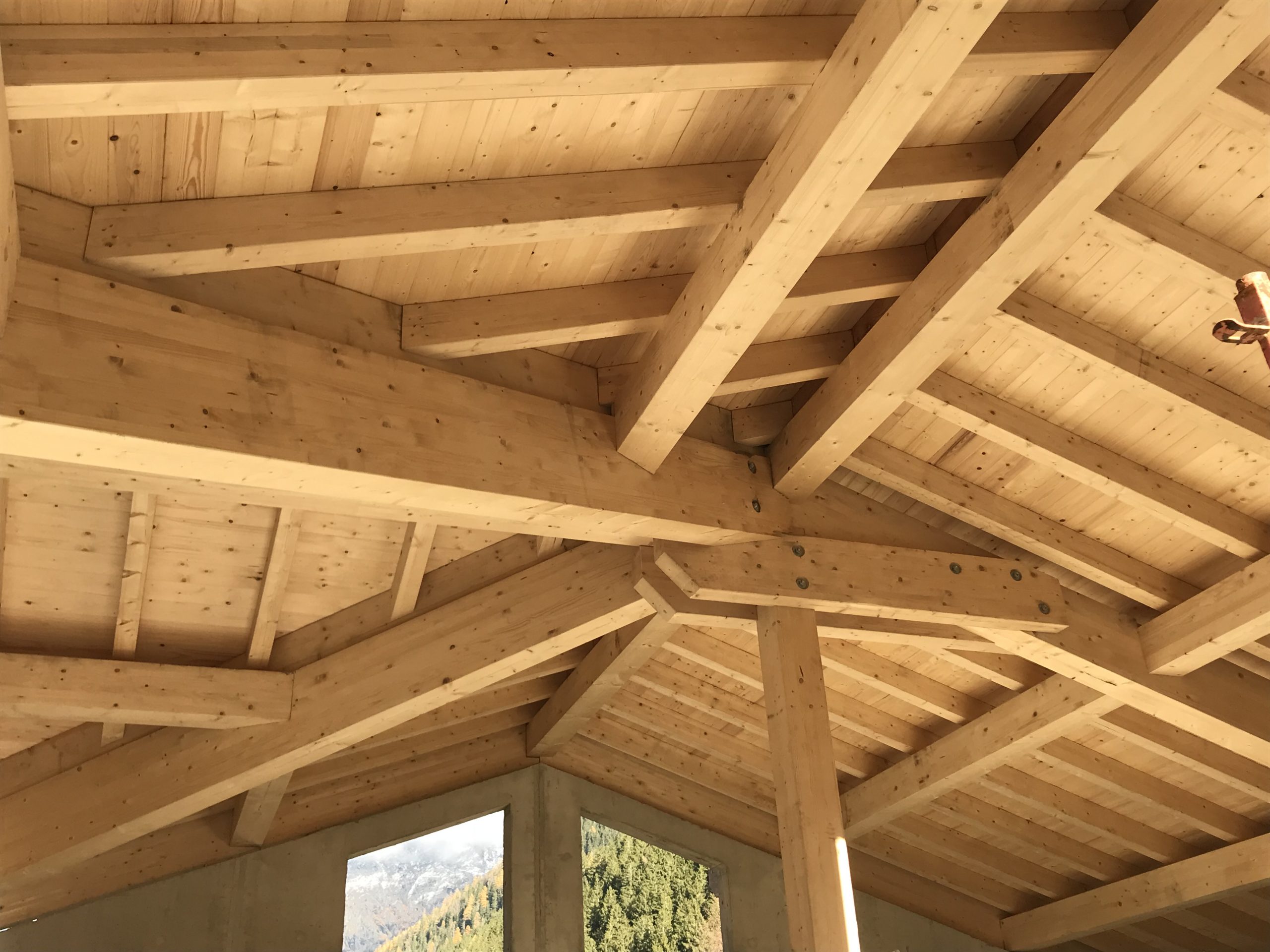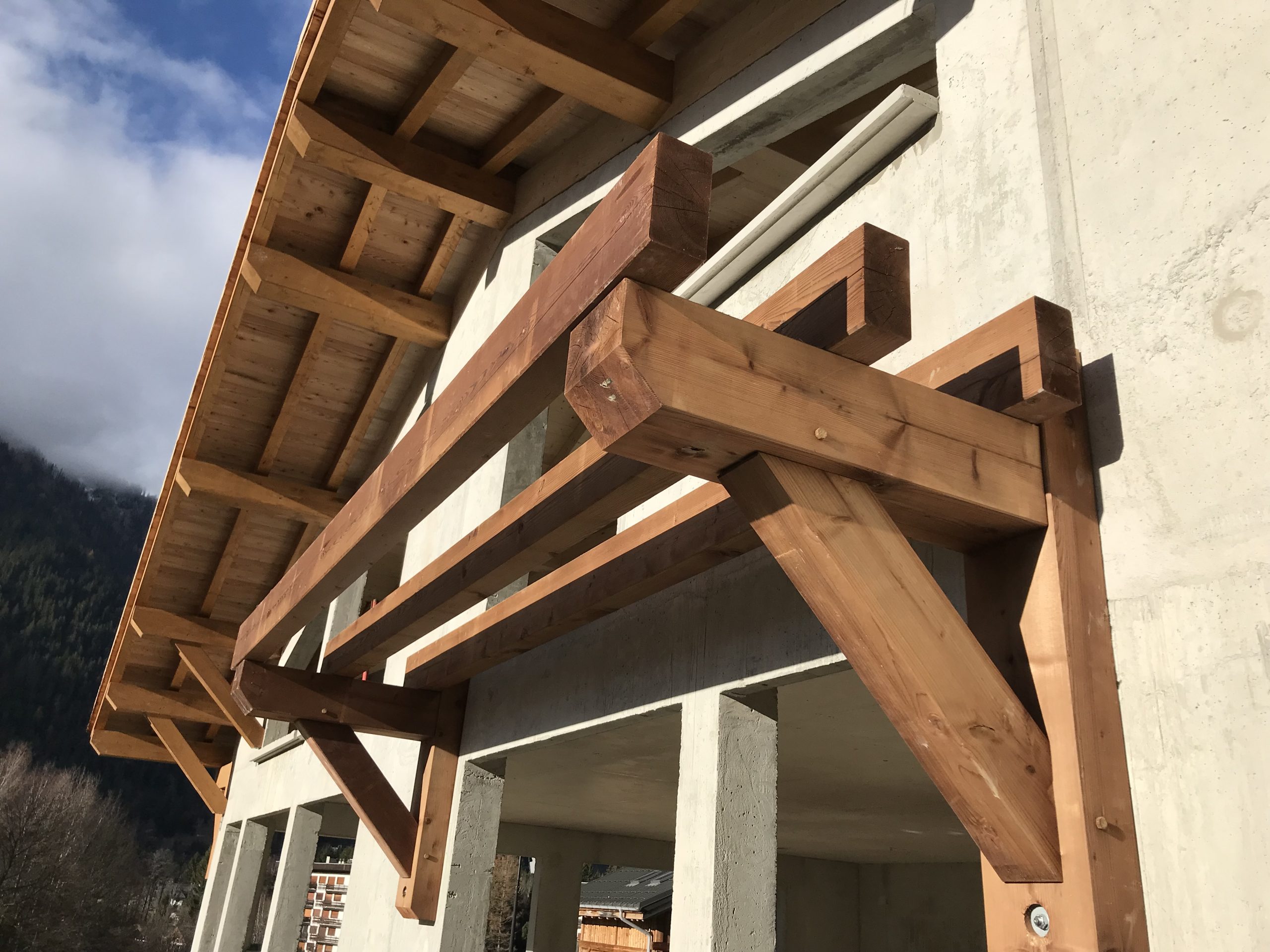 Le bois utilisé est typique des constructions alpines : lamellé-collé et KVH d’origines allemande et nordique, sélectionnés pour leur résistance, leur stabilité et leur teinte chaleureuse.